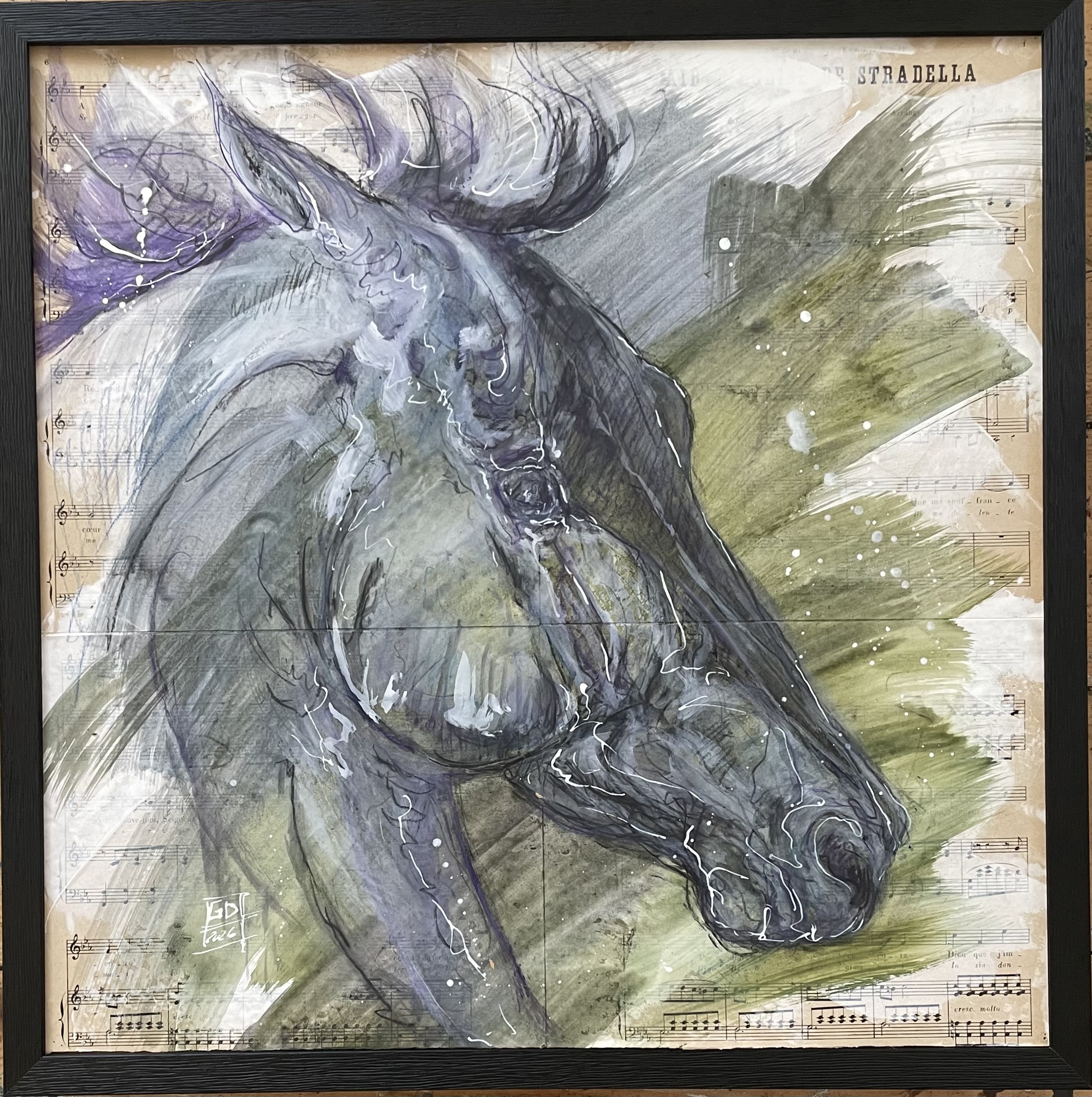 Techniques mixtes sur partitions marouflées - Cadre noir bois et sous verre