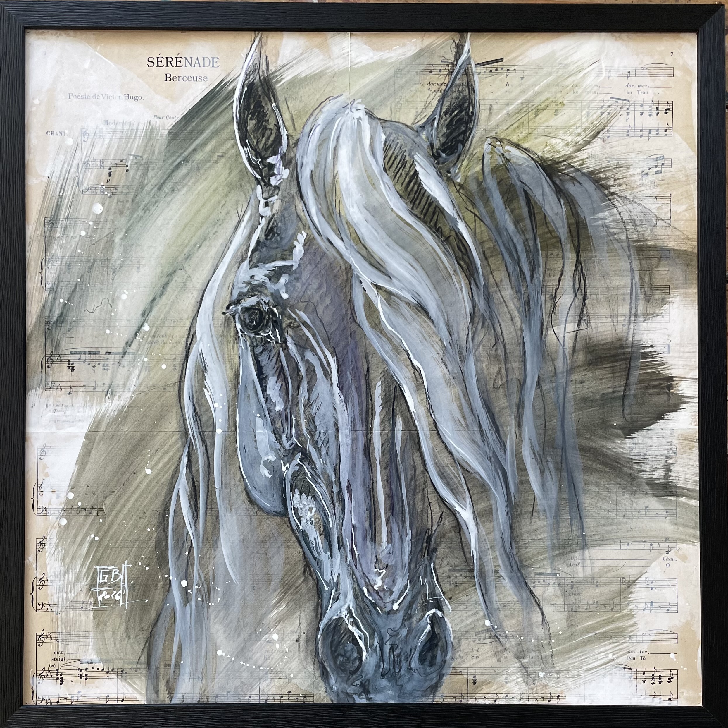 Techniques mixtes sur partitions marouflées - Cadre noir bois et sous verre