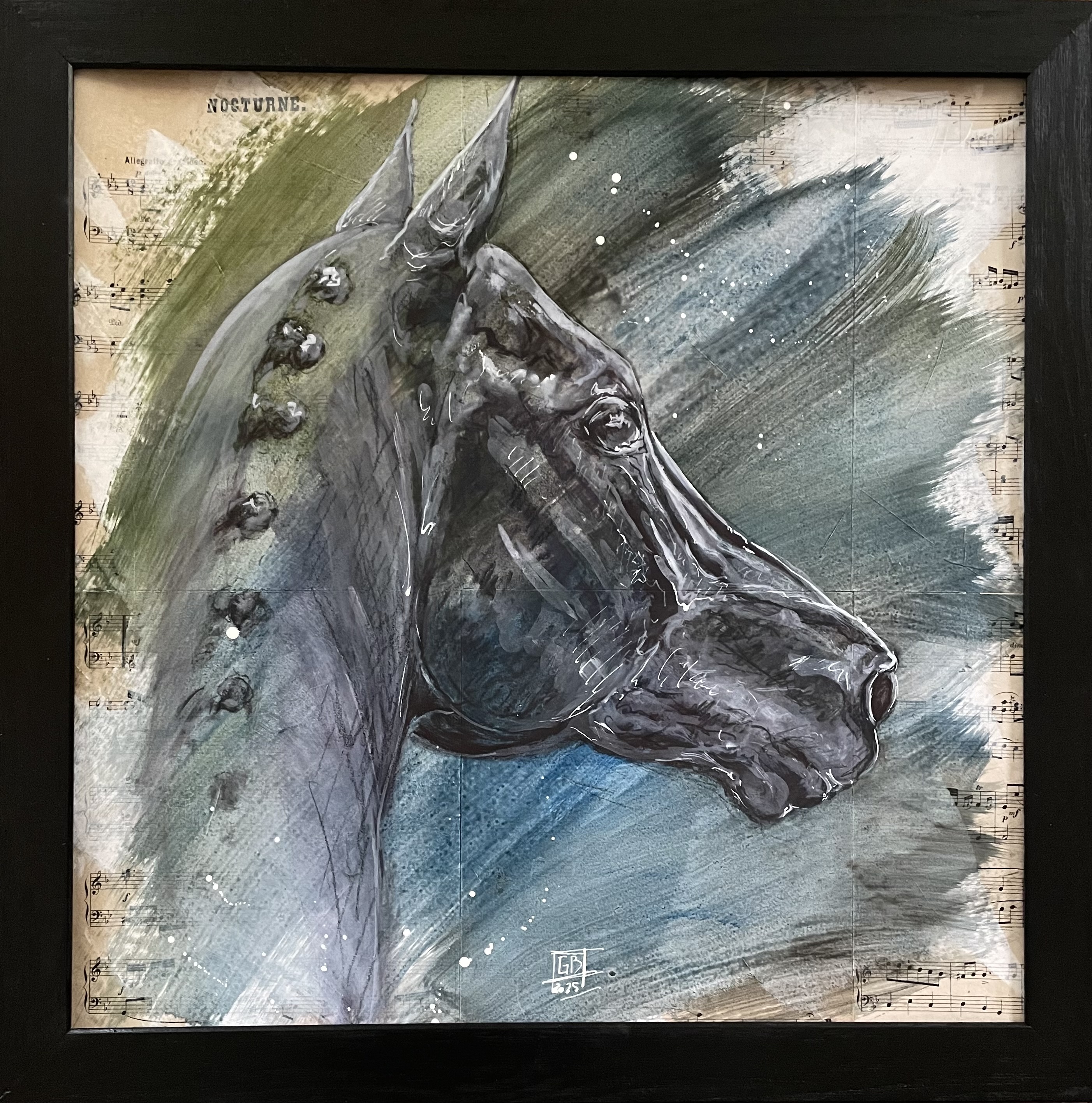 Techniques mixtes sur partitions marouflées - Cadre noir bois et sous verre