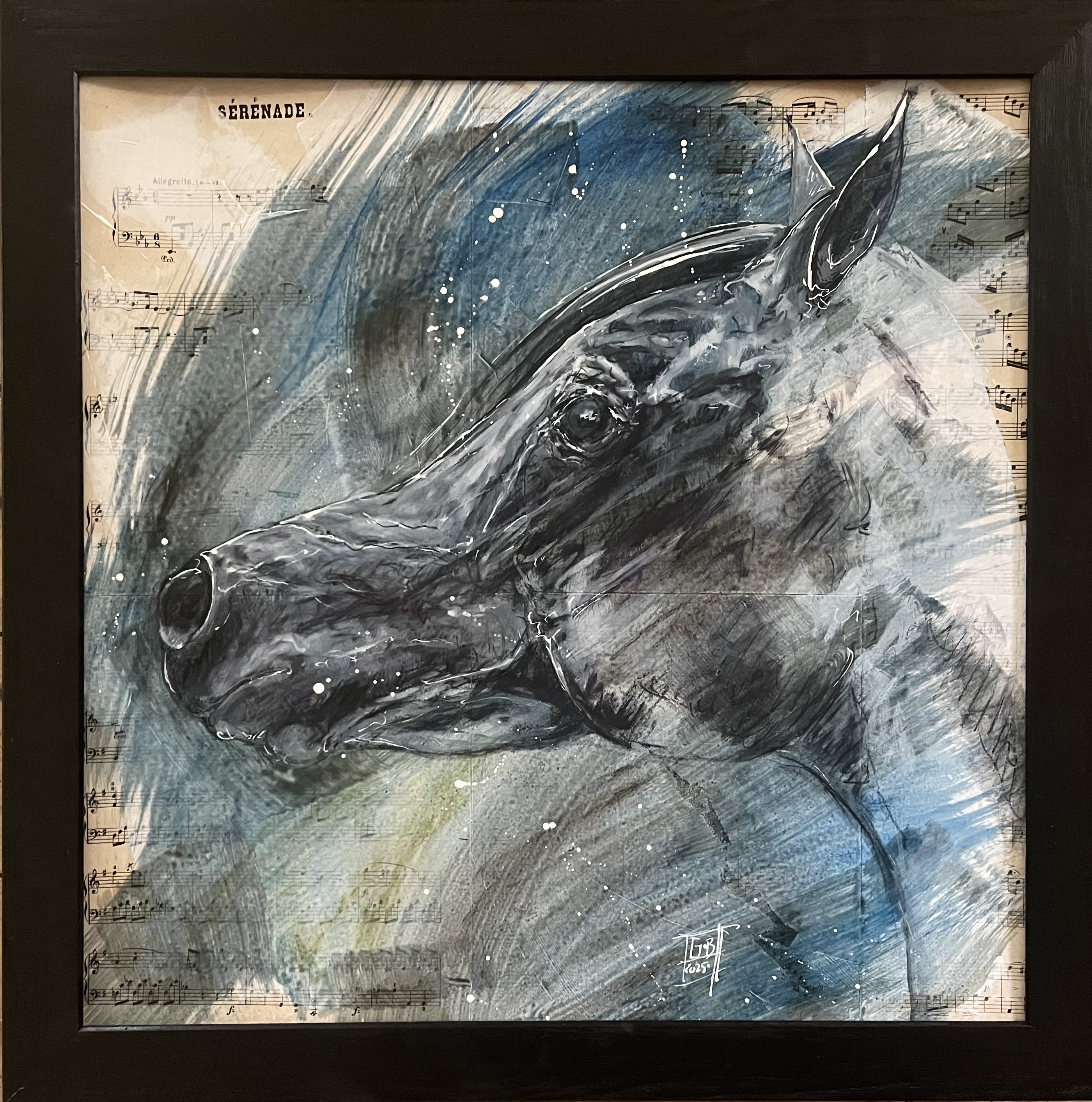 Techniques mixtes sur partitions marouflées - Cadre noir bois et sous verre